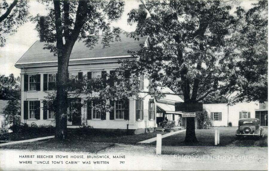 A black and white postcard showing the Harriet Beecher Stowe House in Brunswick, Maine, is postmarked 11/25/1939.Collection