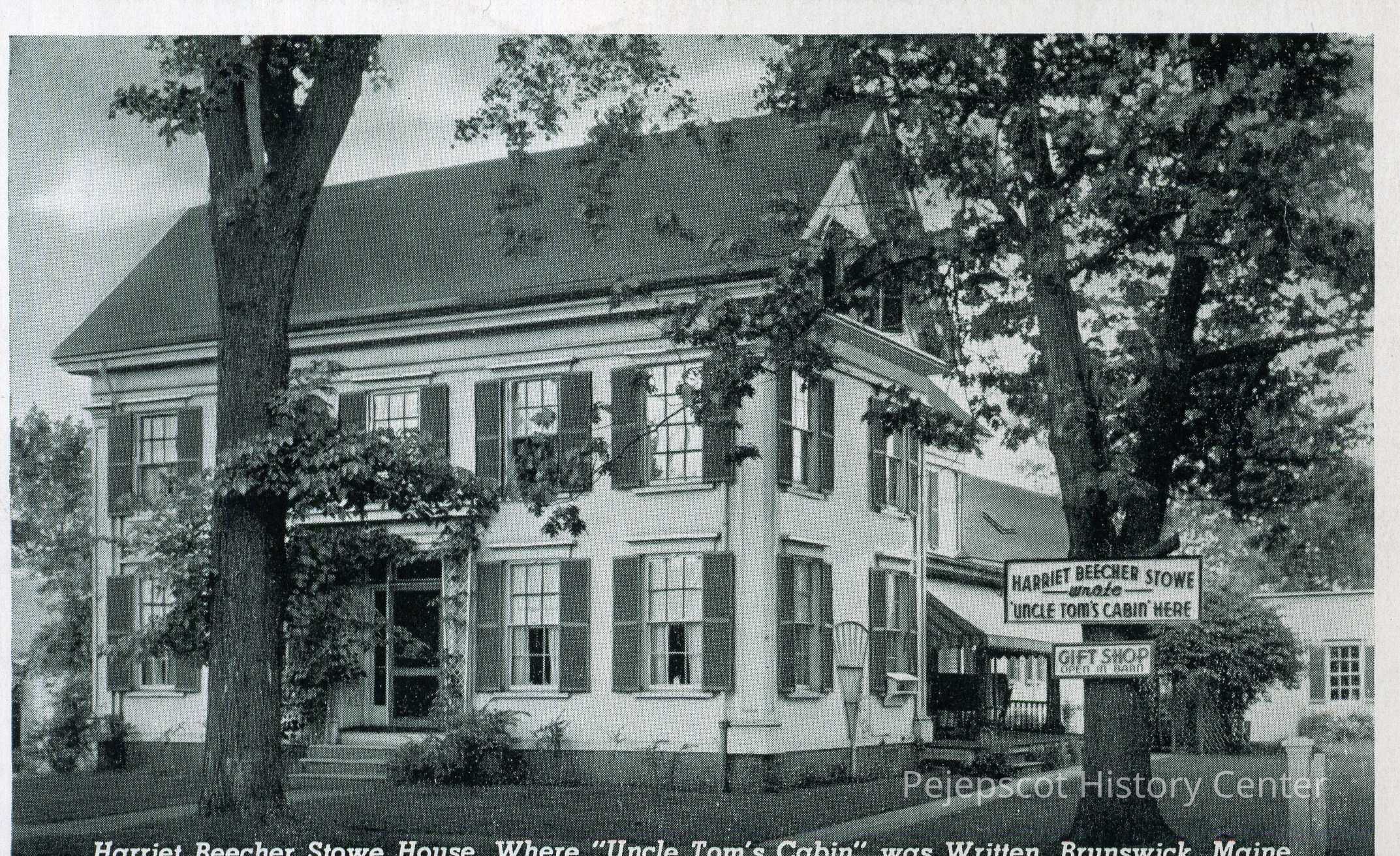 A black and white postcard of the Harriet Beecher Stowe House on Federal Street in Brunswick, created in the 1950's.