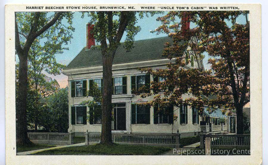 Postcard of the Harriet Beecher Stowe House in Brunswick, Maine, where she wrote the book "Uncle Tom's Cabin." The house is located at 63 Federal Street. Calvin and Harriet Stowe rented the house from 1850 - 1852 while Calvin taught at Bowdoin College. Harriet's book "Uncle Tom's Cabin" was influential across the United States just before the Civil War, at a time when the issue of slavery was in great debate. Harriet left Brunswick with her family in September 1852 for Andover, Massachusetts, where Calvin became a professor at the Theological Seminary.Collection