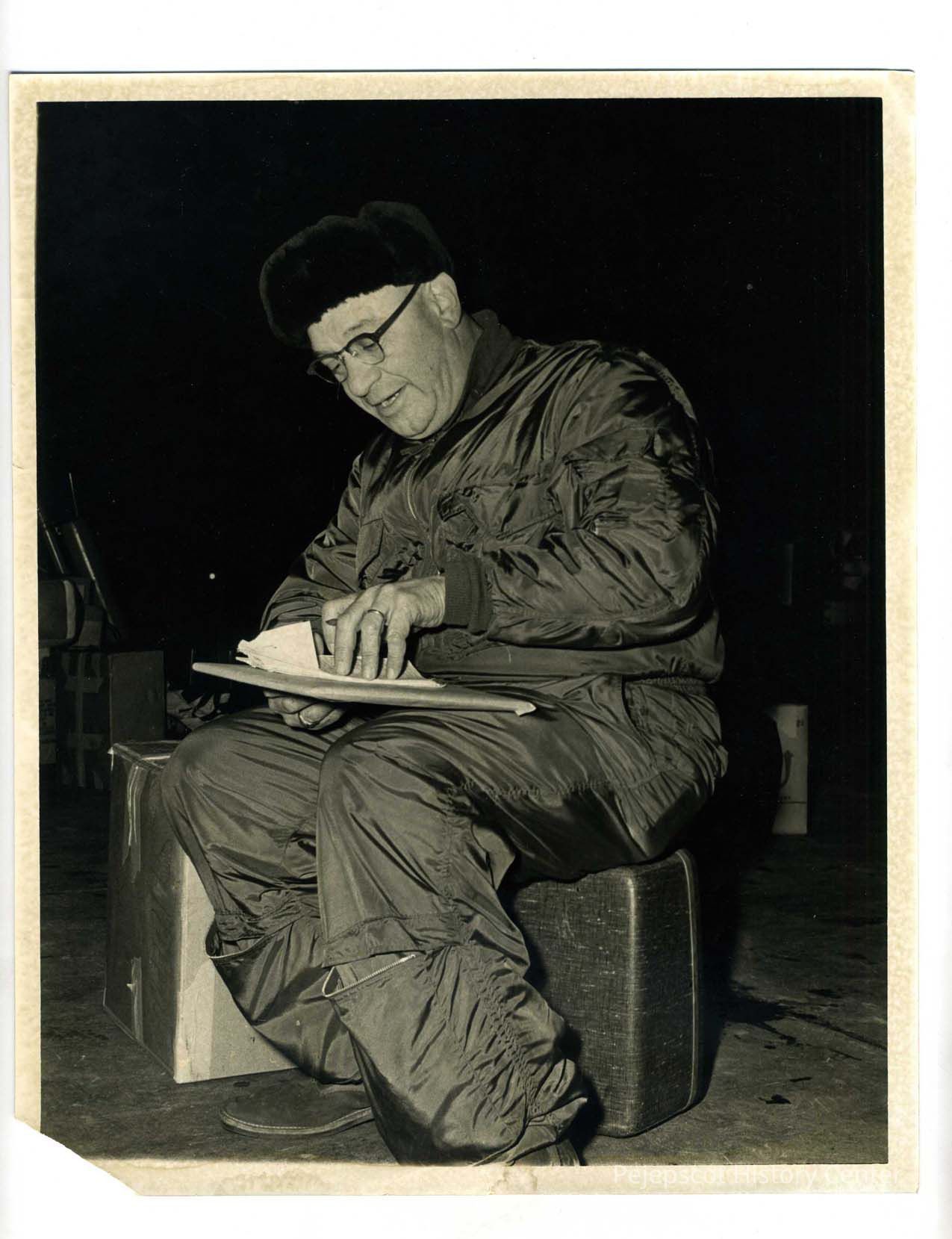 Harry Shulman, in a heavy jumpsuit, is sitting on a suitcase while he writes on a pad. Undated