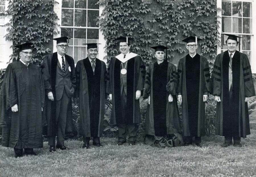 B/W photo of a group of recipients of honorary degrees at Bowdoin College. Harry Shulman is at the far left. No date.