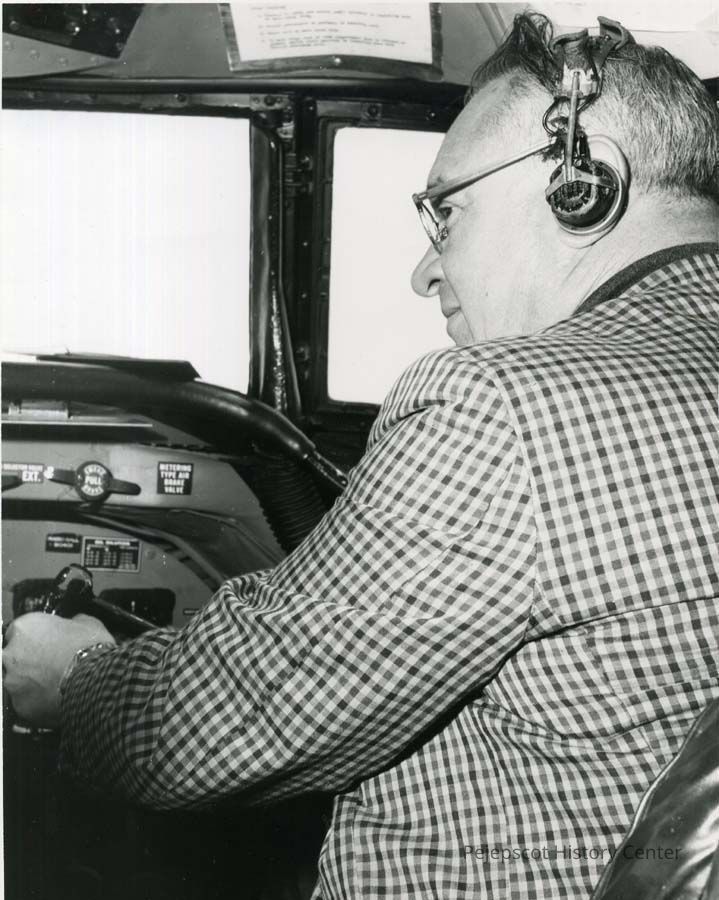 A B/W photograph of Harry G. Shulman at the controls of an airplane. Undated