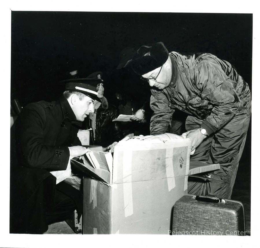 Black and white photograph of Harry Shulman and a Navy officer going through a packed box. Undated