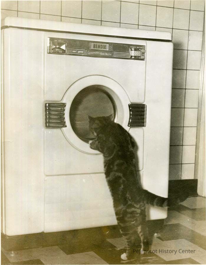 A B/W photograph of Harry Shulman's cat checking out the clothes dryer. Undated