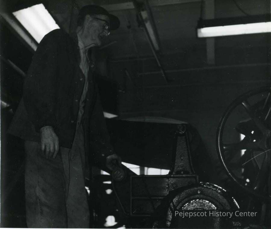 An undated black and white photo of Harry Walker Sr. working on the machinery at the Bowdoin Mill, Pejepscot Paper, Brunswick, Maine.