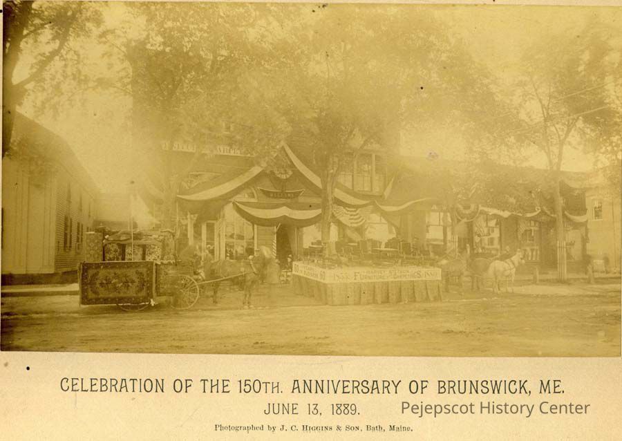 Celebrations - Brunswick, Celebrations - 150th Anniversary of Brunswick, Anniversaries - Brunswick, Parades - Brunswick, Businesses - Brunswick, Furniture Stores - Brunswick, Stores - Brunswick, Horses, Wagons, Streets - Maine, Harvey Stetson's Store, Churches - Baptist Church, Churches - Maine Street Baptist, Carpets