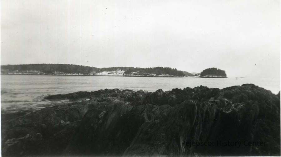 A black and white photo of Haskell Island. The photo is labelled on the back "S. Harpswell", Maine, March 6, 1947.