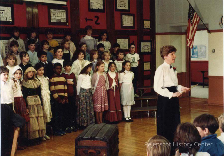 A color photograph of Miss Eddy and the students celebrating Hawthorne School's 90th year. 1984