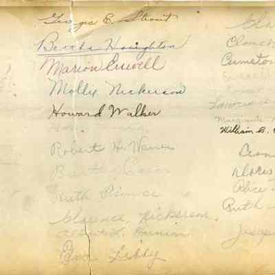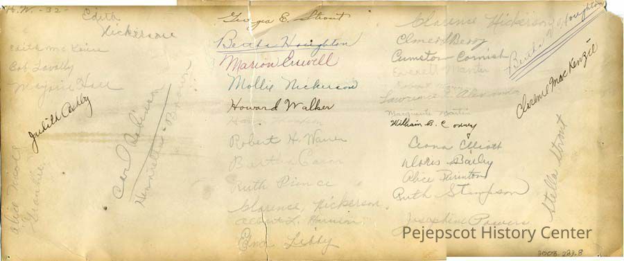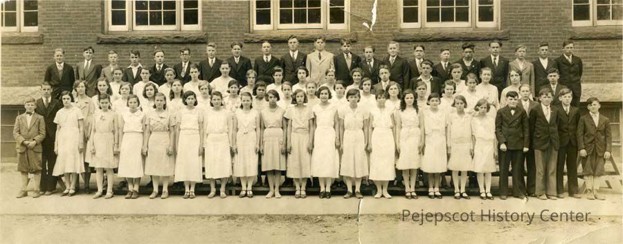 A class picture taken at the Hawthorne School. Written on the back are the following names, with no identification as to where they are in the picture: Edith Nickerson; Edith McGuire; Bob Lavally; Marjorie Hall; Judith Ashby; Alice Nicole; Carol Robinson; Henriette Brown; Georgia E. Strout; Bertha Houghton; Marion Erswell; Mollie Nickerson; Howard Walker; Harry Thompson; Robert H. Warren; Bertha Caron; Ruth Prince; Clarence Nickerson; Albert L. Harmon; Edna Libby; Clarence Nickerson; Elmer L. Berry; Cumston Cornish; Everett Manter; Robert Warren; Lawrence R. Alexander; Margarite Martin; William B. Conney; Leona Elliott; Deloris Bailey; Alice Purinton; Ruth Stimpson; Josephine Power; Clarence MacKenzie; Stella Strout. Undated