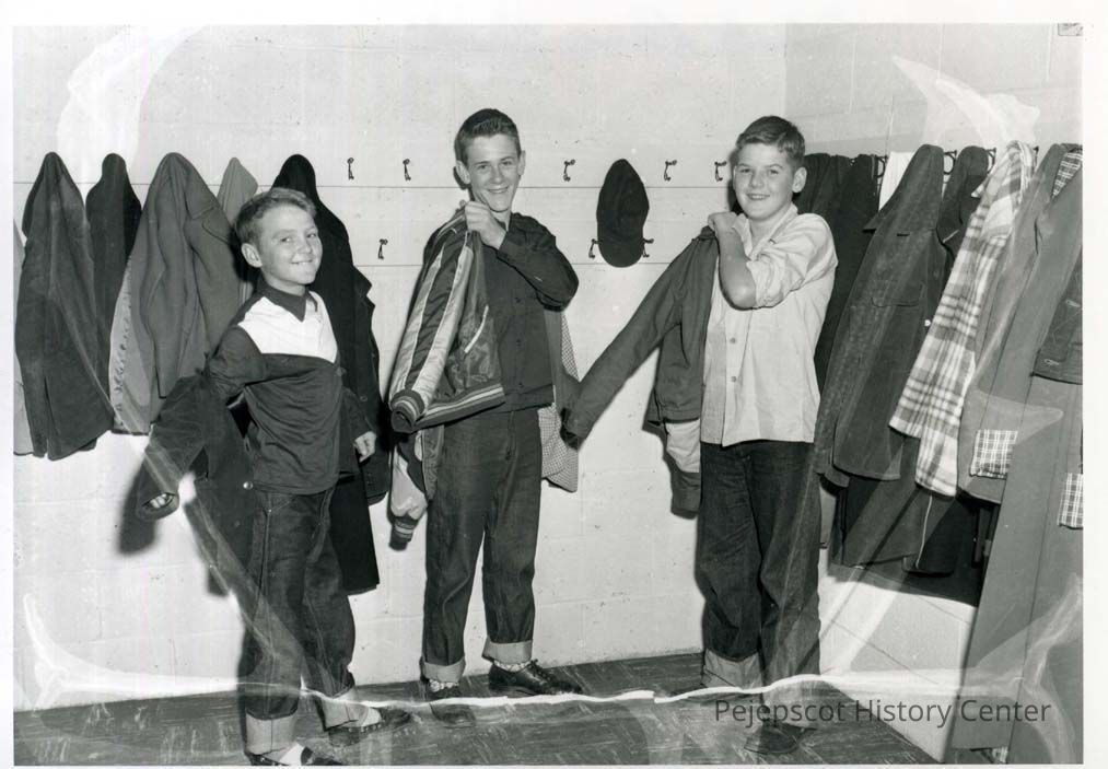 Three boys are putting on their coats in the Hawthorne School cloak room.