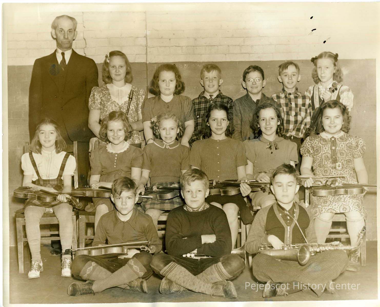 The Hawthorne School orchestra in 1933 or 1934. Front row: ? Sibley, George Dwyer, Hall Graves. Row 2; ? Elliott, Dorothy Combs McKenzie, three unidentified, and furthest to the right Alvina Lachance. Row 3; Mr. Warren, teacher, ? Sewall, Anne Graves, Christies Welder, ?, Donald Lincoln, ?. UndatedLexicon