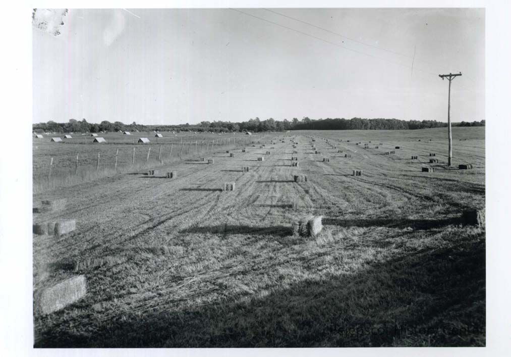 This photo shows a field with bales of hay spread at regular intervals on one side of a fence. On the other side of the fence there is another field filled with chicken shelters.There is a telephone pole on the right.