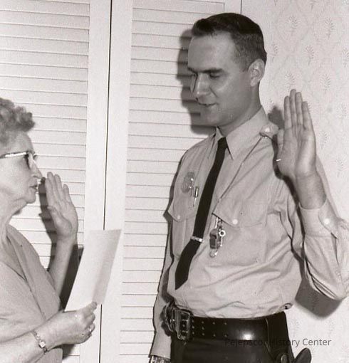 Topsham Town Clerk Mrs. Hazel I. Colby, swears in Ronald Riendeau as Chief of Police. He was the town's first full-time police chief. A version of this black and white photo appeared in The Brunswick Record in Brunswick, Maine, on 6/4/1964.Collection