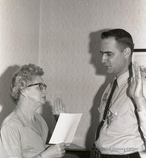 Topsham Town Clerk Mrs. Hazel I. Colby, swears in Ronald Riendeau as Chief of Police. He was the town's first full-time police chief. A version of this black and white photo appeared in The Brunswick Record in Brunswick, Maine, on 6/4/1964.Collection