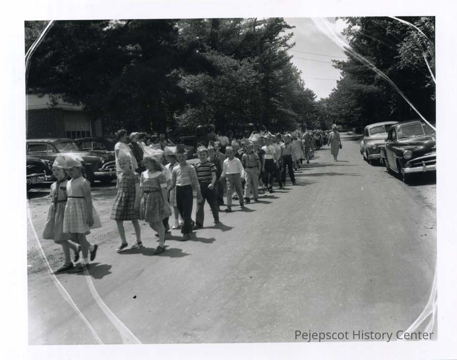 B/W photo of a parade of Longfellow School children on Health Day (6/6/1955) taken on Longfellow Avenue.