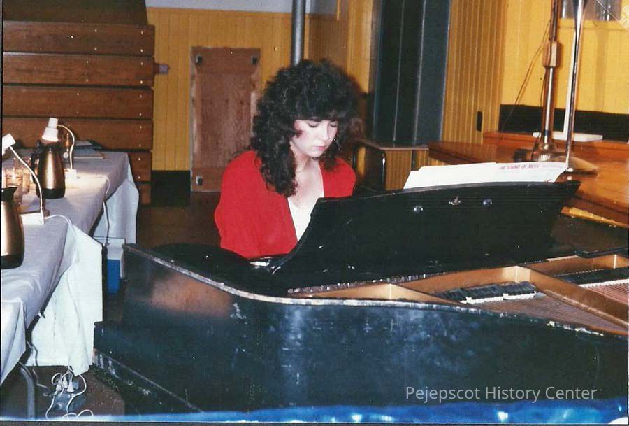 A color photograph of Heather May, contestant # 6 playing the piano for her talent.