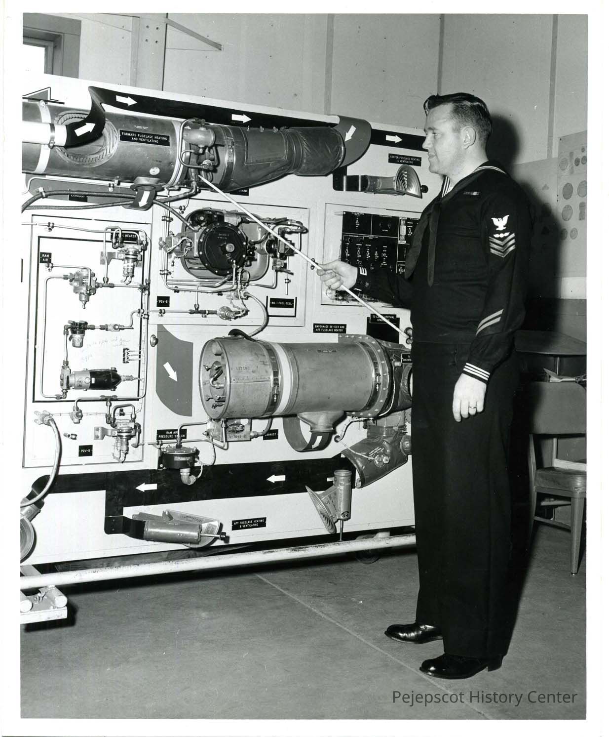 R.D. Martin, AE1, points out the electrical circuit in the heating system of the P2V aircraft. Stamped on the back is "U.S. NAVAL AIR STATION BRUNSWICK, MAINE" and "OFFICIAL U.S. NAVY PHOTOGRAPH NOT FOR PUBLICATION UNLESS OFFICIALLY RELEASED" and "RELEASED IF PUBLISHED CREDIT MUST BE GIVEN AS FOLLOWS 'OFFICIAL PHOTOGRAPH U.S. NAVY'." Undated