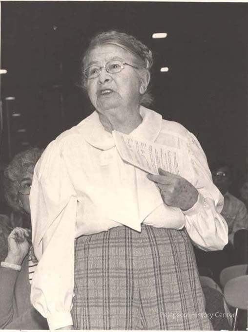 A black and white photo of Helen Dudley of Topsham answering questions about library funding was published in The Times Record in Brunswick, Maine, on 3/10/1986.