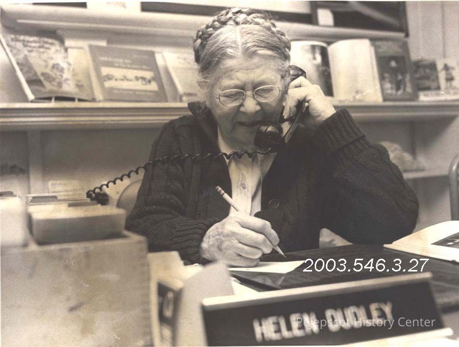 A black and white photograph of Helen Johnson Dudley, 80 years old, and still at her desk at the Topsham Library, was published in The Times Record in Brunswick, Maine, on 3/7/1985.