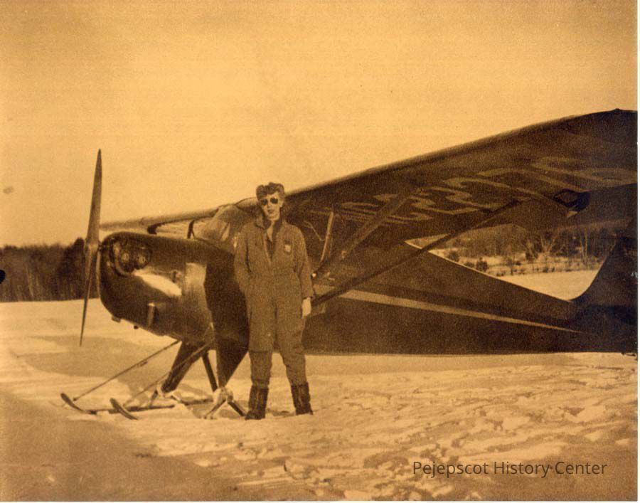 Sepia photo of Helen Schlaack of Brunswick, ME, standing in front of her plane during WW II, when she ferried planes for the U. S. military to Iceland, Newfoundland, and within the U.S. No date.