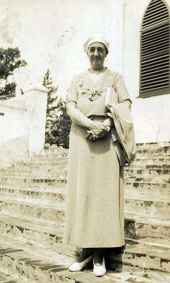 A B/W photo of a woman in front of a church. It is marked, "Helen on steps of old church." Photo is undated.
