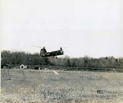 A B/W photograph of a helicopter hovering over the field where Jordan Acres School is now situated (Jordan Avenue). Undated