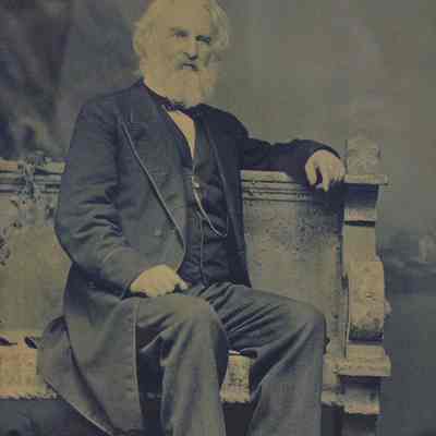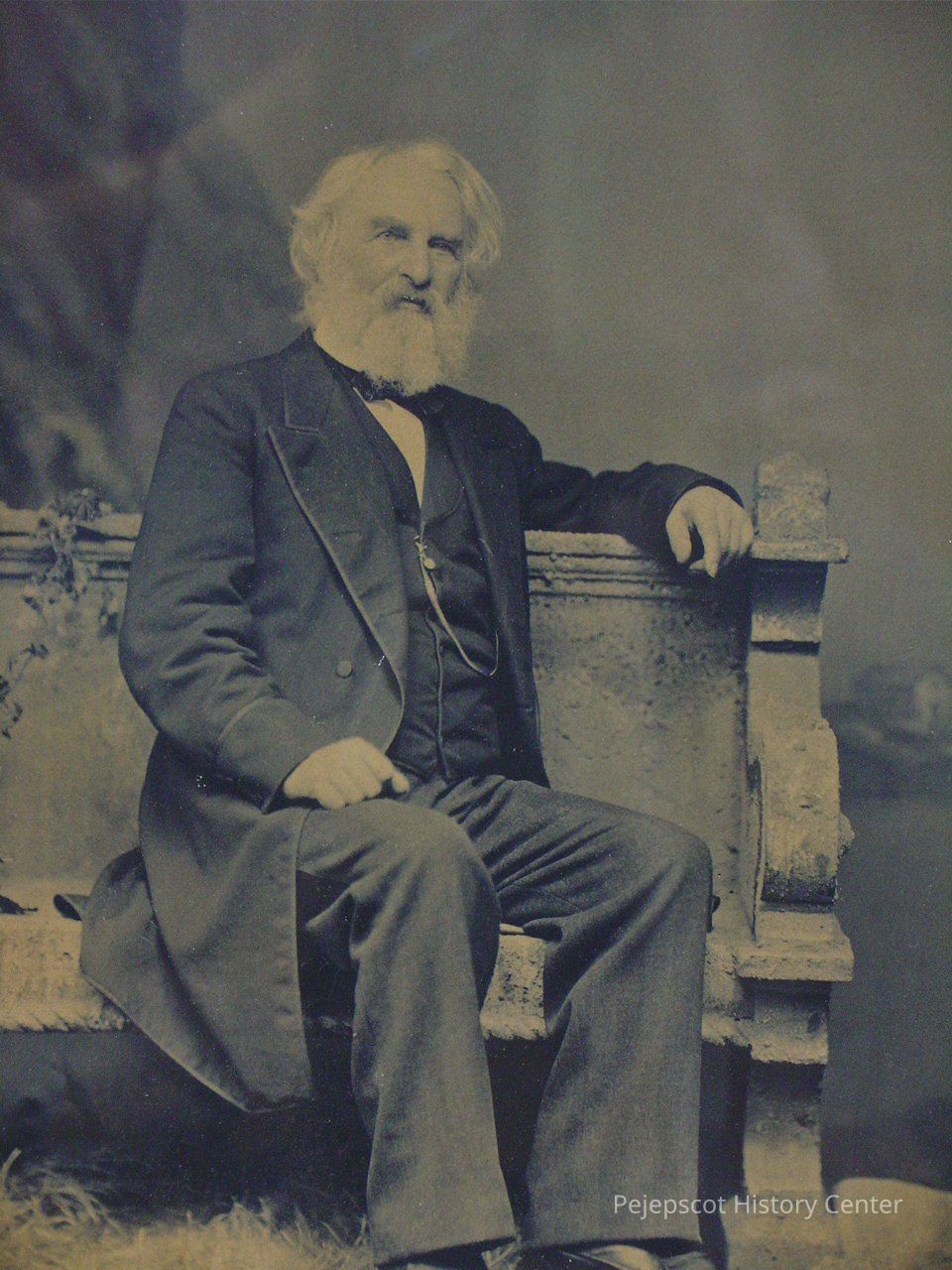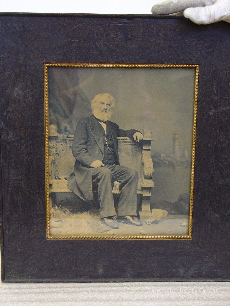 Framed B&W portrait photograph of Henry Wadsworth Longfellow seated on a bench. There is a red seal on the paper backing that reads, "Lamson Studio, Portland Maine. A card thumbtacked on the back reads: " Henry Wadsworth Longfellow photograph by Lamson of Portland" The wide wood frame has a narrow molded plaster frame on the inside edge, giving a beaded effect. Undated.