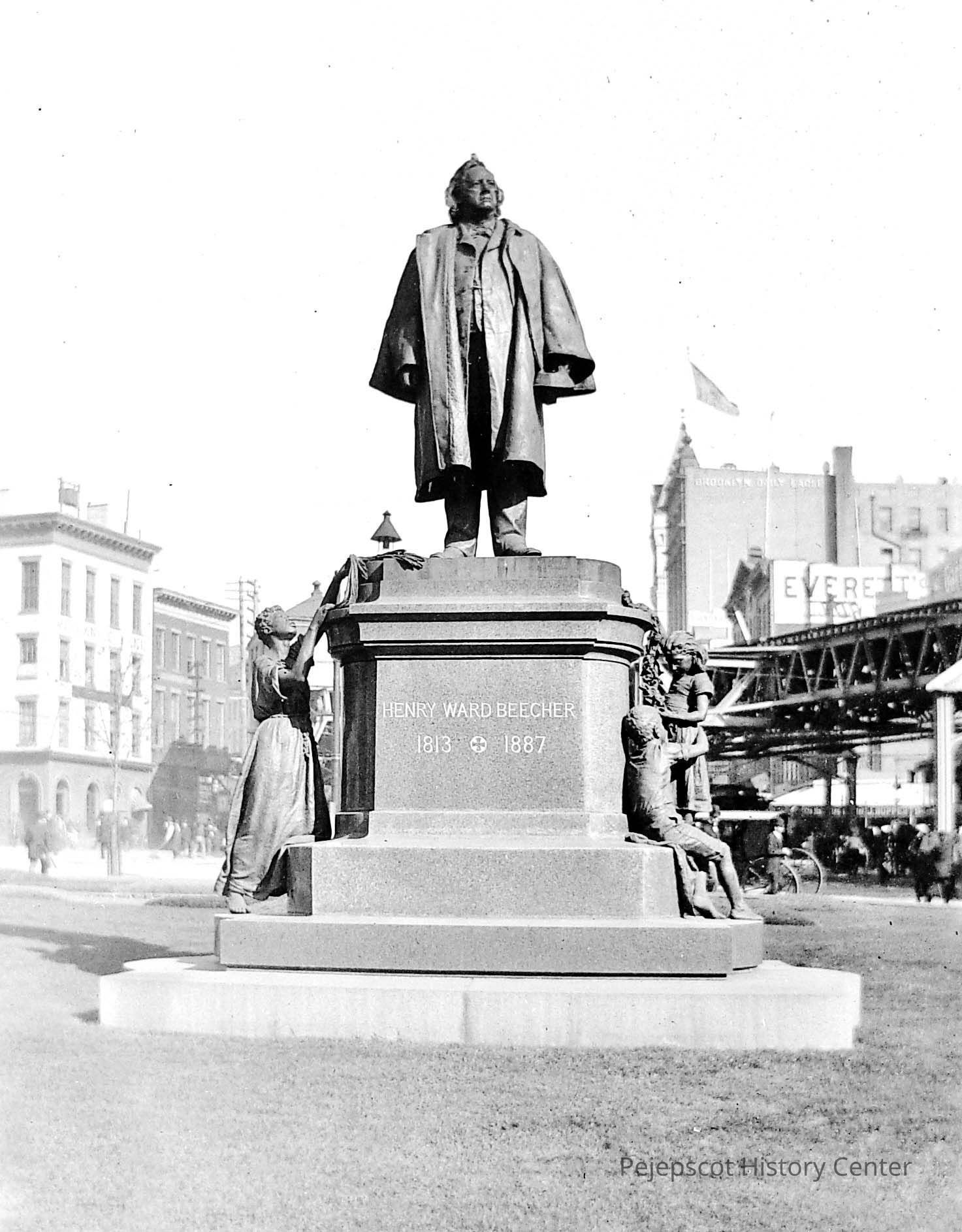 A glass plate negative 043 and with a photograph of a statue of, abolitionist and brother of Harriet Beecher Stowe, Henry Ward Beecher. The statue was originally unveiled in 1891 at Borough Hall and then moved to Columbus Park in 1959, both located in Brooklyn, NY.