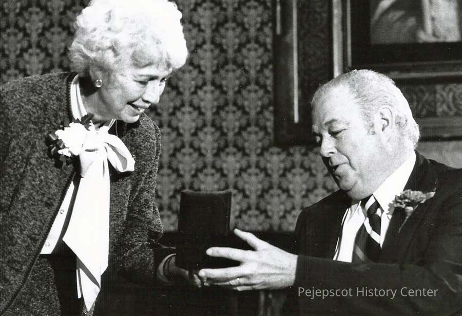 A B/W photograph of Mr. Herbert Merrill of Brunswick receiving a 1981 Jefferson Award Bronze Medallion for Greatest Public Service Benefitting the Disadvantaged at the Awards luncheon held in Portland on 02/19/1981.Collection