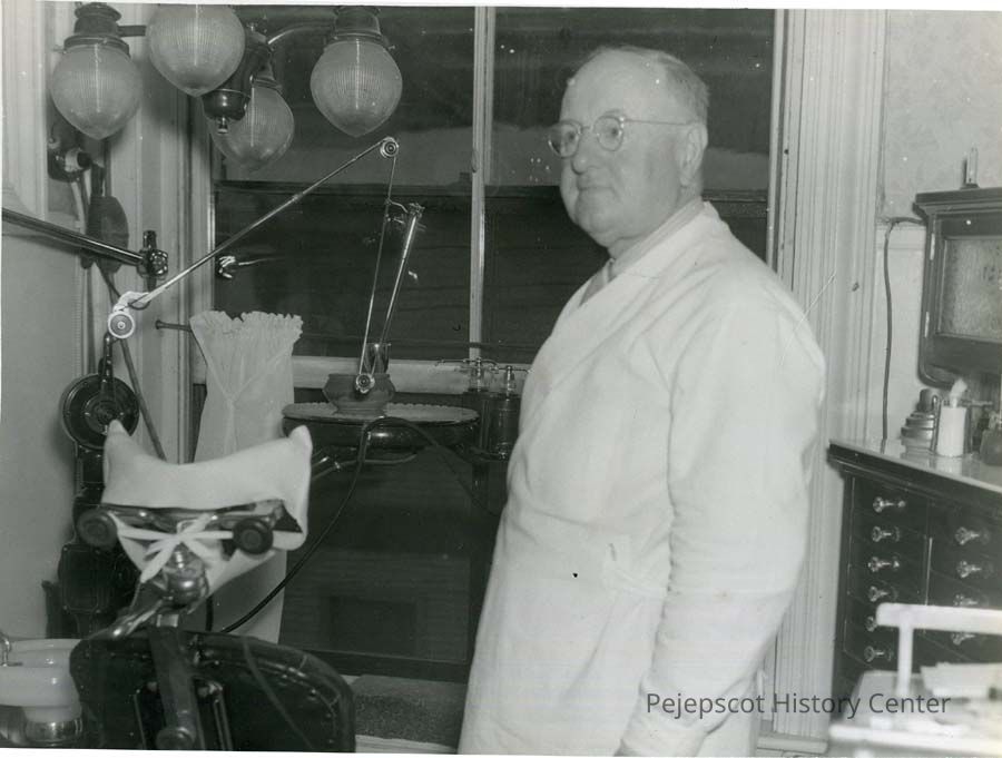 A B/W photograph of Dr. Herbert R. Brown, Dentist standing by the empty patient's chair. That chair now belongs to PHS and is stored in the barn. Undated