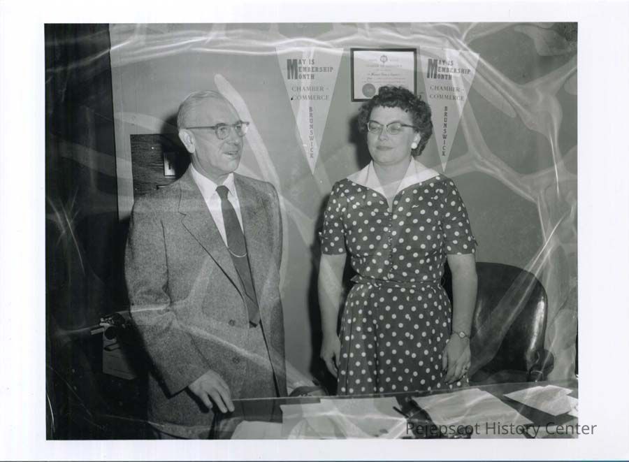 B/W photo of Larry Hess and Mrs. Merle Norton standing behind a desk.
