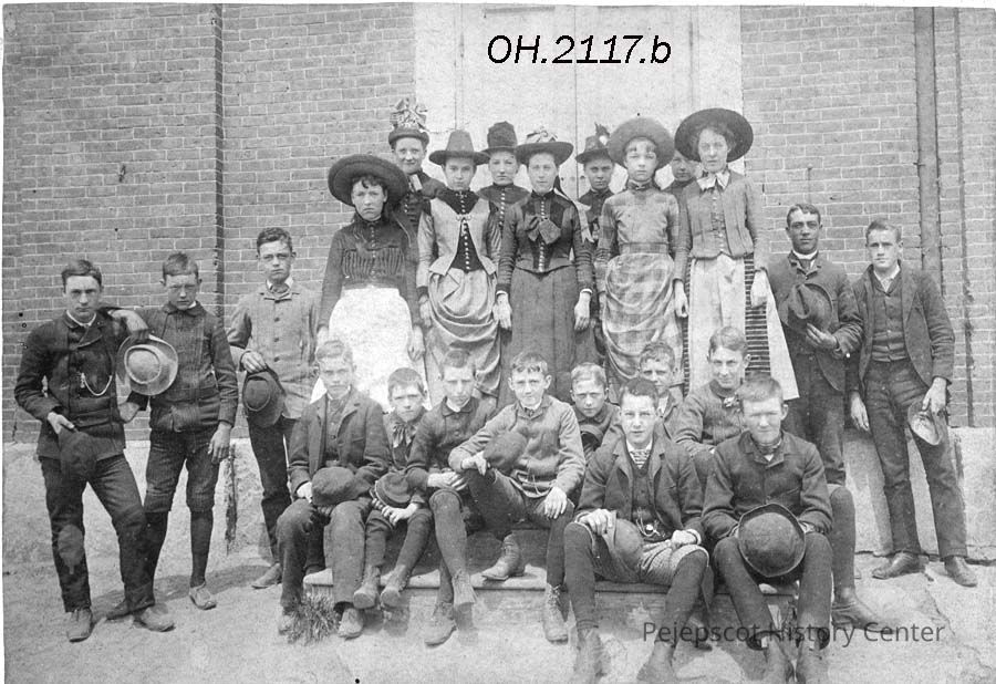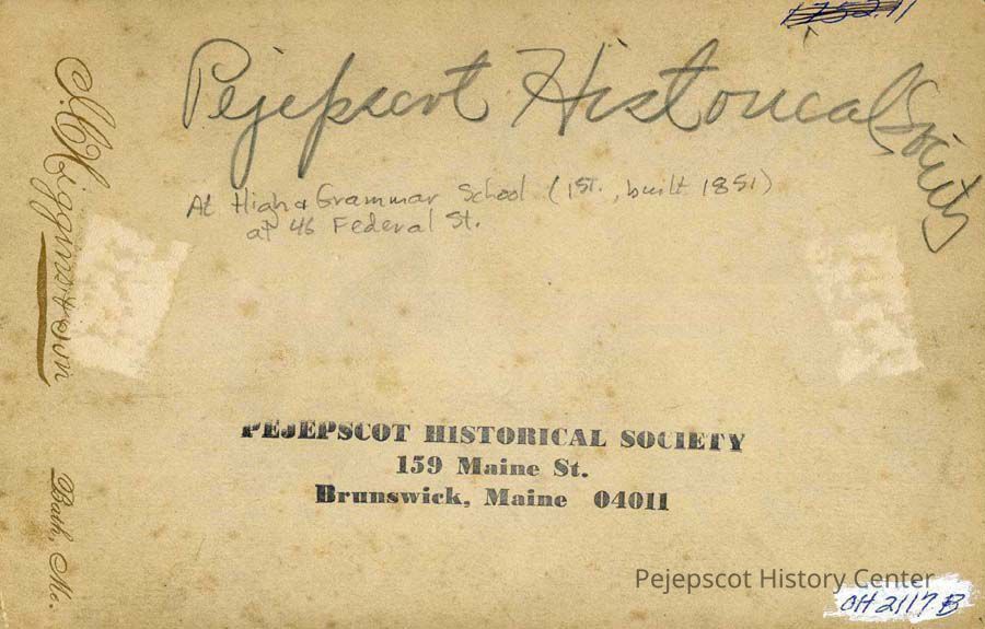 A B/W photograph of an unknown school group, c. 1890. The school pictured is the Hawthorne School, once the High & Grammar School, at 46 Federal Street, Brunswick, ME. It was first built in 1851.