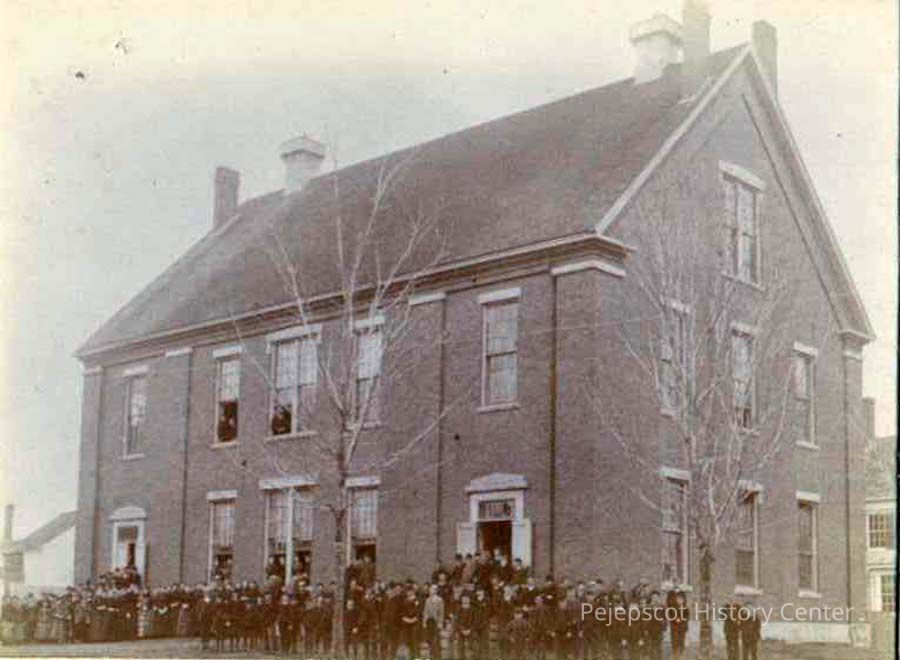 A B/W photo of the old high school on Green Street, Brunswick, ME. Undated
