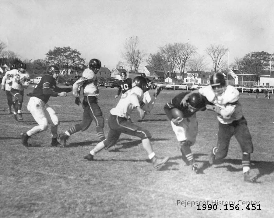 A B/W photograph of a High School football game being played on Edwards Field, Jordan Avenue in Brunswick. c. late 1940s