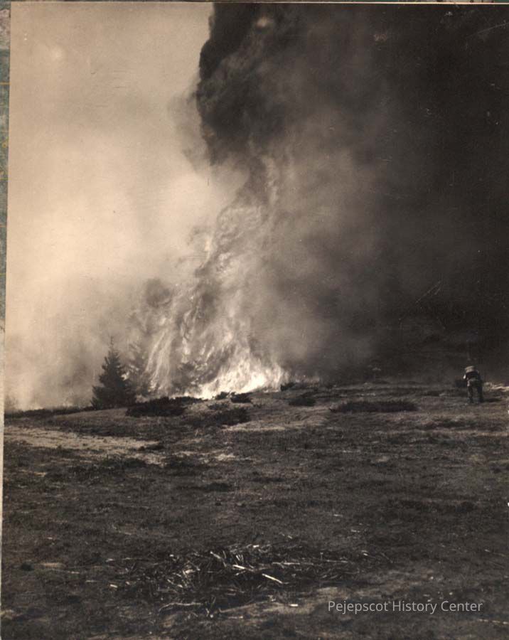 A B/W photograph of the Hillside to Base Fire. The fire was started by a train at Hillside. It jumped Harpswell Road and ended up on the Base. Undated