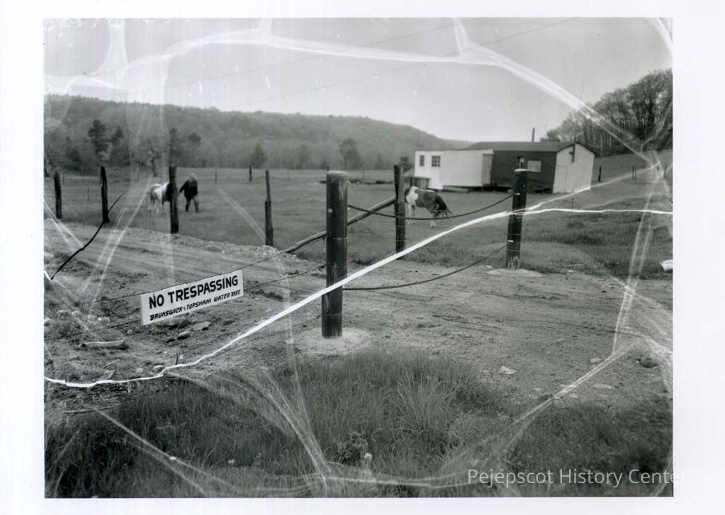 The Water District buys the Holden Farm in Topsham. The Air Force plans to drill a well there for it's water supply. The picture shows a field with a small camp on it and a man leading a horse toward another horse. A "No Trespassing / Brunswick Topsham Water Dist." hangs for a fence appears in the foreground.