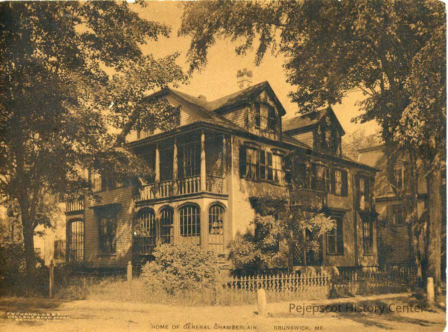 A sepia photo of the Chamberlain home. Under the photo reads, "Home of General Chamberlain Brunswick, ME" and in the lower left corner, "F.W. Chandler + Son College Book Store Brunswick, ME".Lexicon