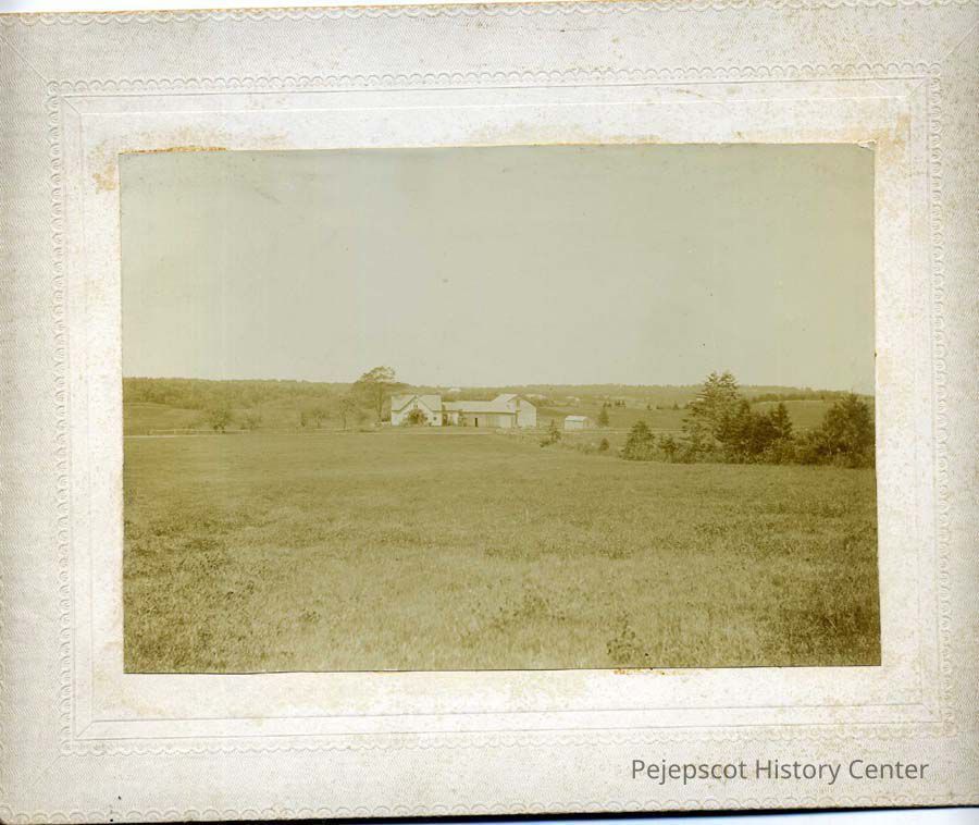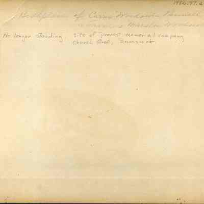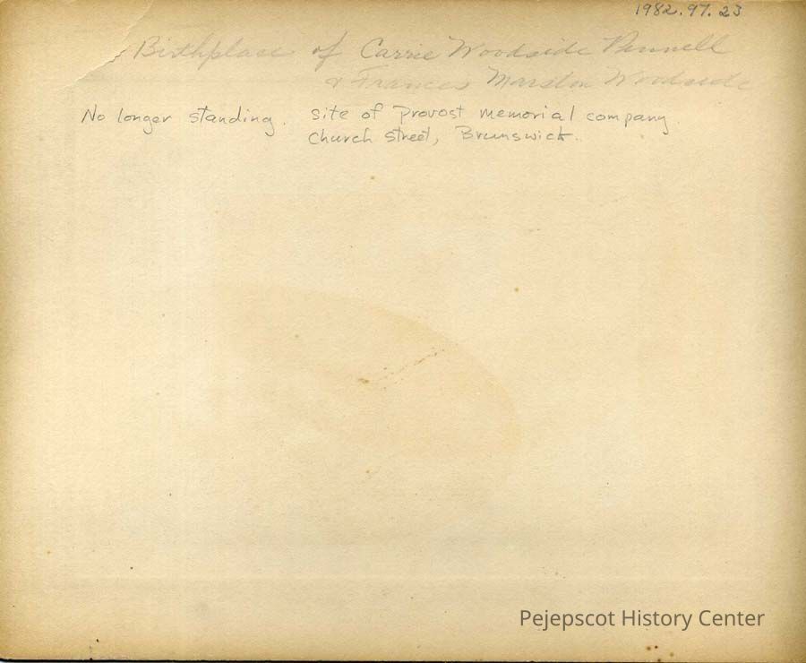 Black & white glossy mounted photograph of a homestead, back reading: Birthplace of Carrie Woodside Pennell & Frances Marston Woodside. No longer standing, site of Provost Memorial Company, Church Street, Brunswick."