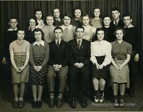 A B/W photograph of the Honor Society Brunswick High School 1940. Front row: Elizabeth Bacon (Yanok); Eva Hall (Tuttle); Summer Holbrook; Ernest Estes; Willa Leslie (Grant); Margaret Dunlop. Second row: Erwin Hutchins; Eleanor Lek; Mary McKeen; Arlene Smith Small (Littlefield); Elizabeth Kilbride; Raymond Boucher; Third row: Doris Gooch (White); Louise Boucher Dumais; ?; Olivette Menard (Doyon); John Thalheimer.