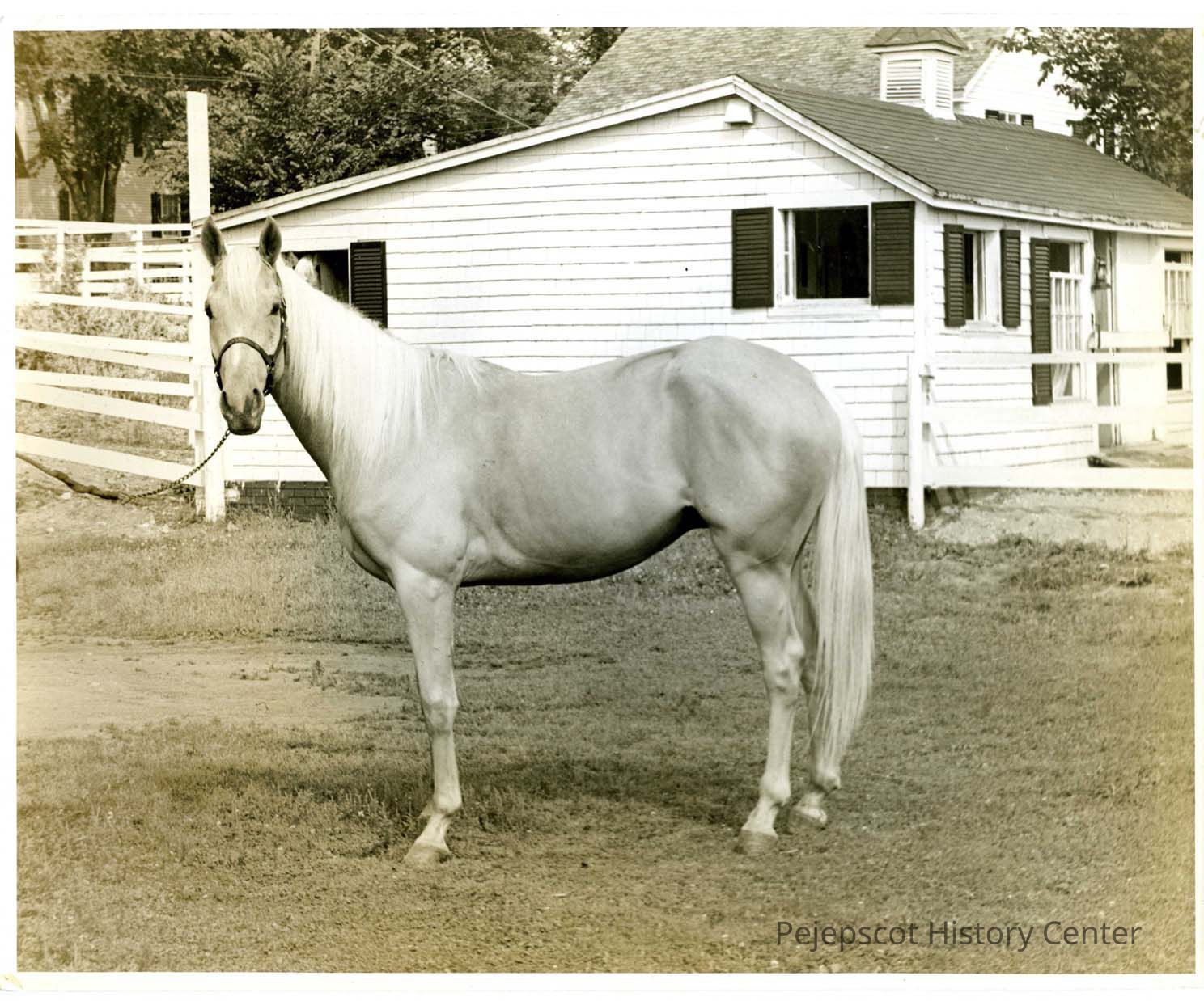 A palomino horse standing tethered outside at Skipper Bartlett's riding stable on McKeen Street. Undated