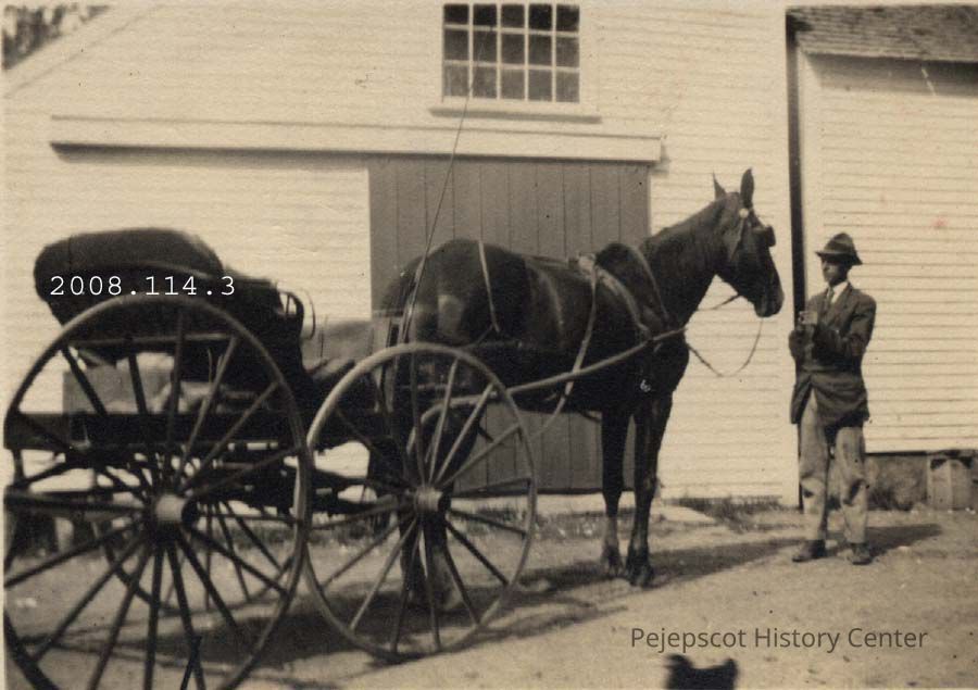 A B/W photograph of a horse and wagon at Spinney's. A man is holding the horse. There is a barn in the background and the top of a dog's head at the bottom. Undated