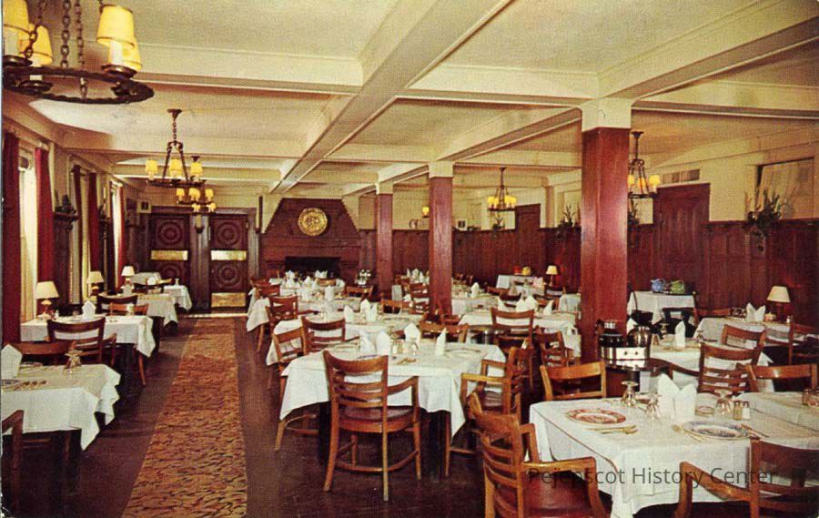 An undated color postcard shows the dining room at the Hotel Eagle, 28 Middle St, Brunswick, Maine.