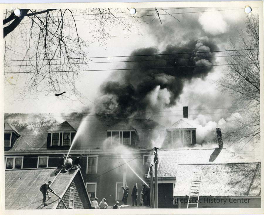A black & white photograph of the Hotel Eagle fire on Middle St., Brunswick, ME. Firemen can be seen hosing the fire from roofs and the street as the smoke grows.
