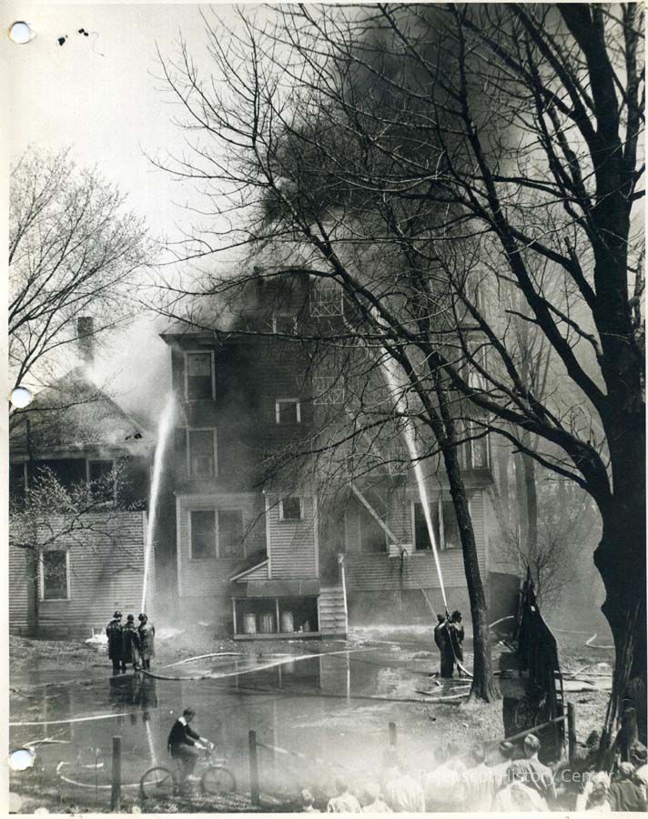A black & white photograph of the Hotel Eagle fire on Middle St., Brunswick, ME. Firefighters can be seen spraying the hotel while a crowd of people watch on. Dated May 1, 1944.