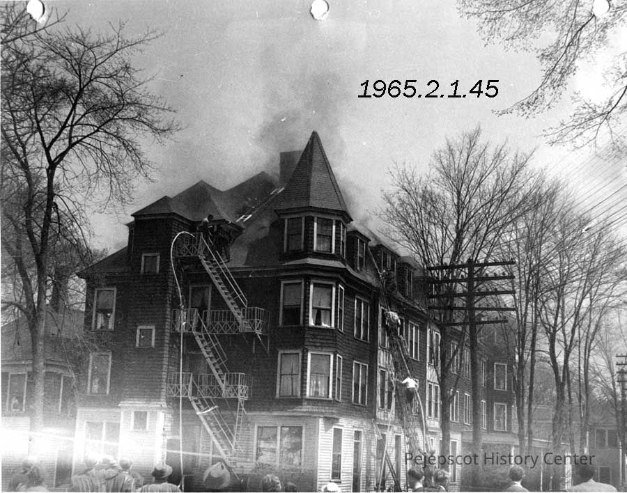 A black & white photograph of the Hotel Eagle fire on Middle St., Brunswick, ME. The photo is part of a collection of local fire photos, collected by former Brunswick firefighter Alfred LeTarte.