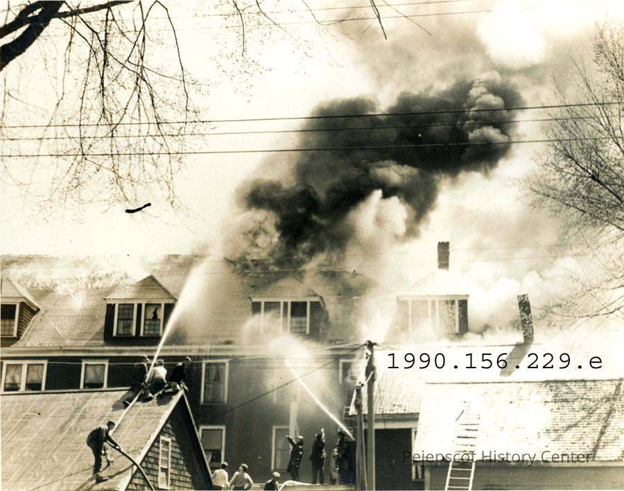 A B/W photograph of the Hotel Eagle on fire. 05/01/1944
