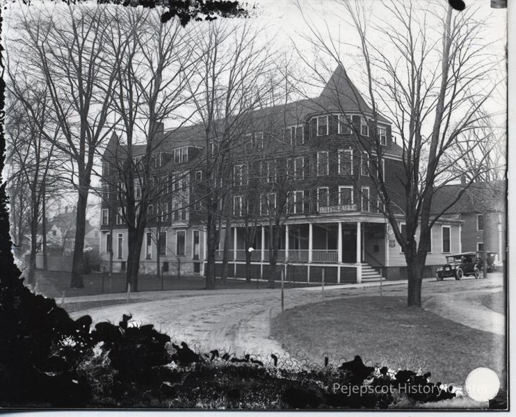 Photo of the Hotel Eagle near the MCRR station, Brunswick, Maine. The Hotel Eagle was located at 28 Middle Street across the street from the railroad station. The hotel, the railroad station, and that part of Middle Street south of Elm Street were removed to make room for what became the Hannaford Supermarket and its parking lot. The Hotel Eagle stood approximately where the Hannaford building now (2011) stands.Lexicon