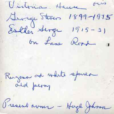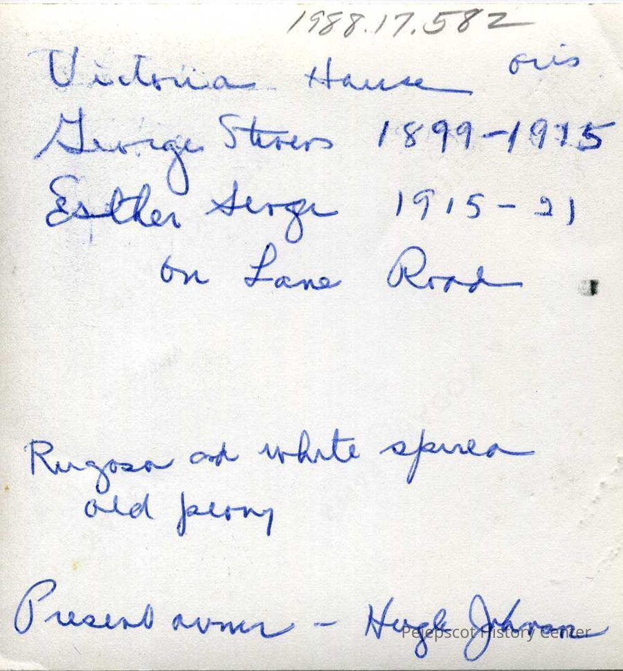 An undated black and white photograph of a house on Lane Road on Orrs Island. According to writing on the back of the photograph, it belonged to George Stevens from 1899 to 1915, and Esther Serge 1915 to 1921. At the time of its donation in 1988, it belonged to Hugh Johnson.