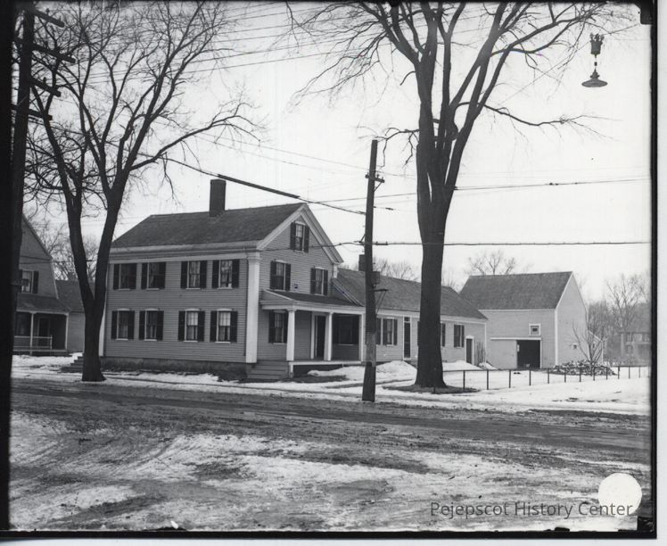 Photo of a house at 22 Pleasant Street, Brunswick, Maine. The first floor of the house has been converted to a store, and the barn at the rear has been demolished. The house at rear right in this photo has been removed for the Brunswick Post Office.