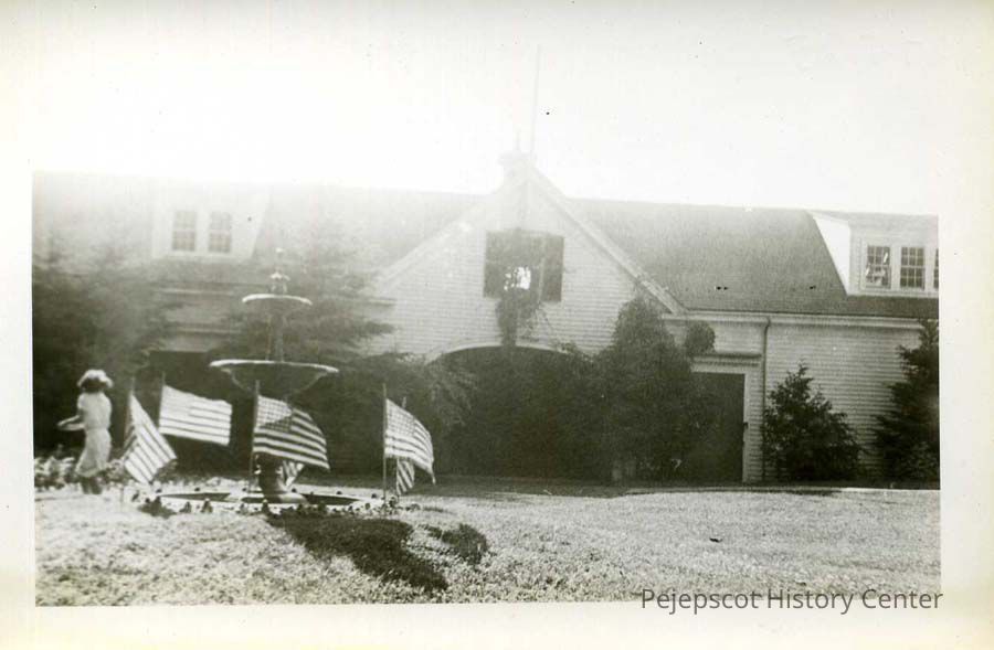 A B/W photograph of a house with flags displayed during the Brunswick Bicentennial. Dated 1939.